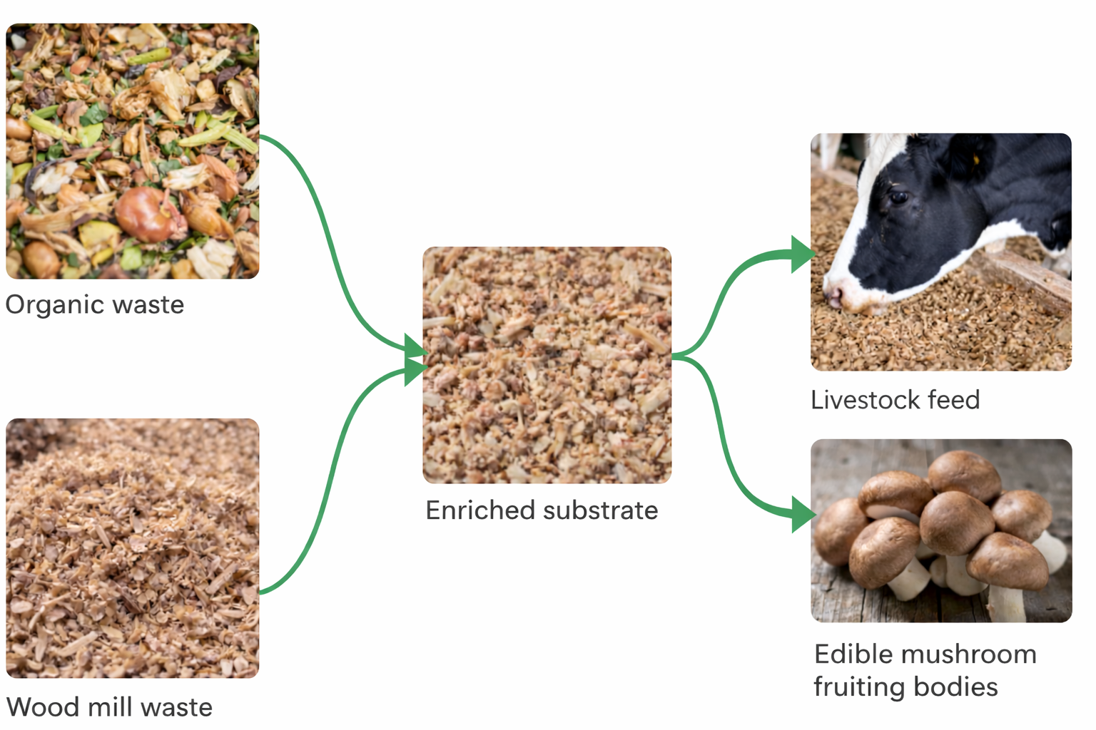 As a natural by-product of this process, we also generate edible mushroom fruiting bodies, which are directed toward human consumption markets.